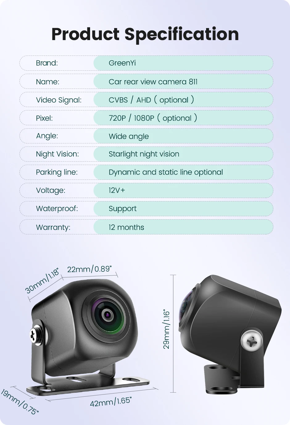 * Ширококутний об'єктив, нічне бачення з зоряним світлом, водонепроникний IP68, пилонепроникний, антитуманний, ударостійкий, нормально працює на автомийці або в негоду.