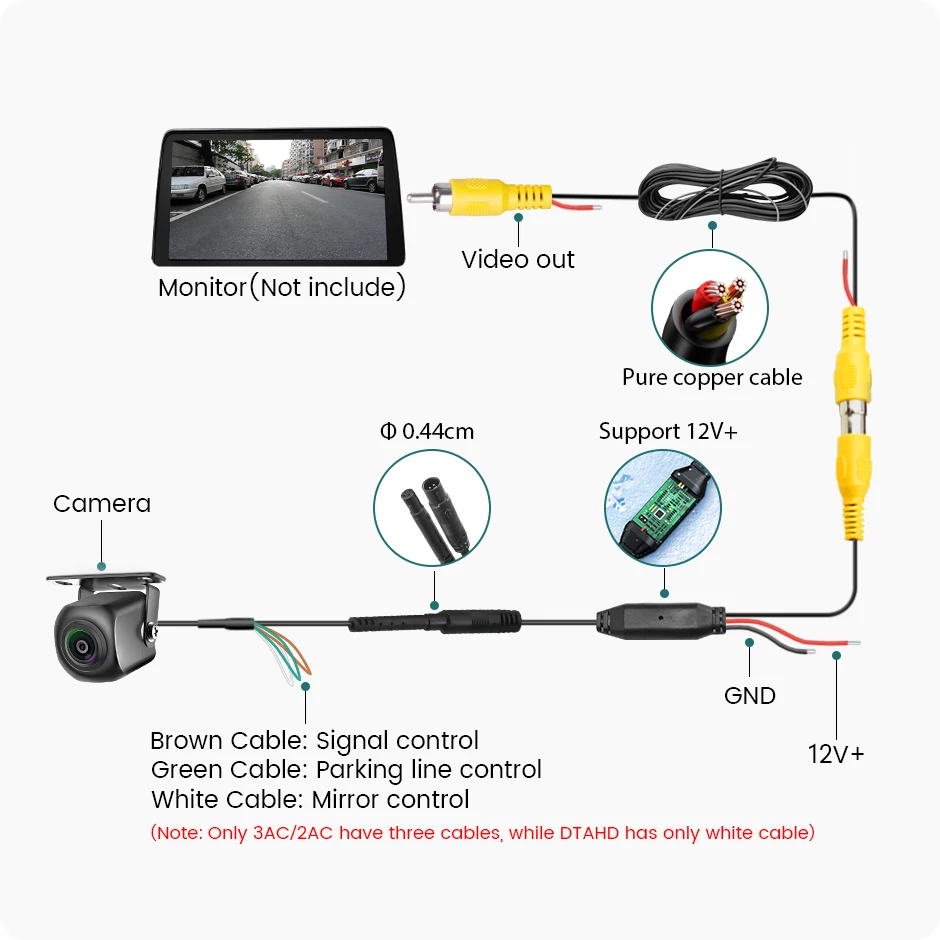 * Універсальна камера DTAHD з динамічним інтелектуальним відстеженням траєкторії руху назад. Їй не потрібен блок керування траєкторією руху, інтерфейси CANBUS або OBD, вбудований модуль відстеження траєкторії руху назад. Камера підтримує лише монітори Aftermarket, Android DVD та монітори з вхідним роз'ємом RCA.